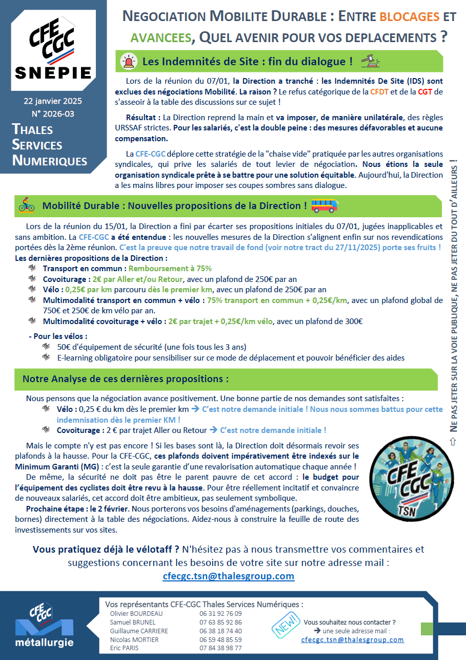 Nous déplorons cependant le blocage sur les Indemnités de Site (IDS), où l'absence des autres syndicats laisse les mains libres à la Direction pour imposer ses règles.